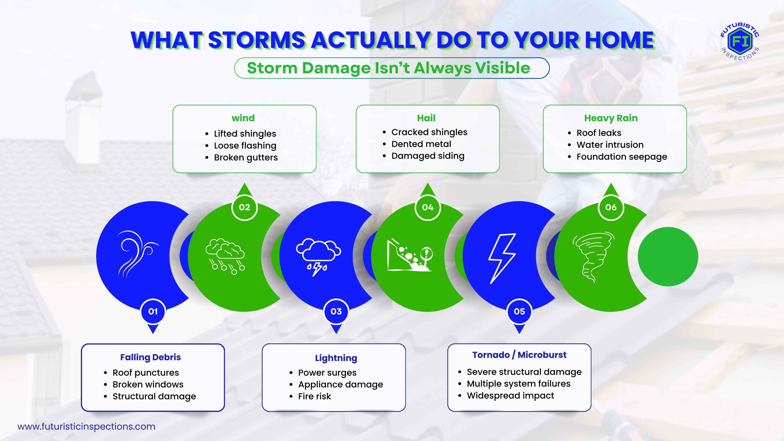 A storm can do a lot more to a home than you can see standing in the front yard. Skipping the inspection is one of those decisions that feels fine until it isn’t, and by the time it isn’t, you’re looking at bigger repair bills, denied claims, and damage that should have been caught early. A few hours of inspector time after a storm pays for itself many times over in the average case. When you’re ready to schedule a post-storm walkthrough, we’re happy to come take a look and give you a clear picture of what the storm actually did to your home. At Futuristic Inspections, we’ve worked through enough storm seasons to know exactly what to look for and how to document it properly for both your records and your insurance carrier. Give us a call when you’re ready, and we’ll take it from there.